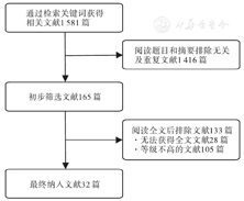 磁敏感加权成像(susceptibility weighted imaging, SWI )于1997年由美国人Reichenbach等发明,并于2002年在美国获得专利权[1]。SWI是一种采用完全流动补偿、高分辨率、3D薄层采集的MRI新技术,其利用组织间磁敏感差异、通过相位后处理突出显示血液中的顺磁性物质,例如去氧血红蛋白、细胞内的高铁血红蛋白、血铁质等。因此,SWI对显示静脉结构、血液代谢产物、铁质沉积等十分敏感,尤其在脑血管病、脑外伤、脑肿瘤、神经变性病等中枢神经系统病变的诊断中有广泛的应用价值[2]。目前,脑静脉及其相关疾病的影像学检查方法主要包括MRI各序列以及CT。本文以"磁敏感加权成像""脑静脉""血管畸形""缺血性卒中"和"susceptibility weighted imaging""cerebral veins""vascular malformation""ischemic stroke"作为关键词,在中国知网、万方数据、PubMed、Web of Science等数据库检索2017年12月之前发表的有关SWI对脑静脉及其相关疾病研究的相关文献,重点纳入近5年文献。共查阅文献1 581篇,删除1 549篇,最终纳入32篇(图1)。本文重点讨论SWI基本原理及其在脑静脉相关疾病诊断中的应用,为脑静脉相关疾病的影像学诊断提供更为简便有效的依据。