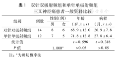 患者按住院号末位单双号法分为双针双极射频组(14例)和单针单极射频组(12例)。双针双极射频组14例,左侧6例、右侧8例。单针单极射频组12例,左侧5例、右侧7例。2组患者性别、年龄、病程等一般资料比较,差异均无统计学意义(P值均>0.05),见表1。
