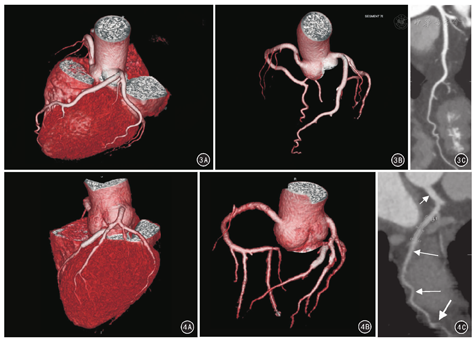 MSCTA图像分析显示,以D、A、C、B组为序,噪声依次降低(分别为15.09±2.97、2.68±2.47、2.57±2.29和2.45±4.36),SNR依次升高(分别为63.74±19.78、78.64±14.66、78.66±14.84和79.66±22.90);D组与A、B、C组两两比较,噪声高而SNR低,差异均有统计学意义(P值均<0.05);A、B、C组间噪声及SNR两两比较,差异均无统计学意义(P值均>0.05)。4组冠状动脉图像质量主观评分优良率98.9%(1 939/1 960),4组间比较差异均无统计学意义(P值均>0.05);A、B、C、D辐射剂量依次降低,分别为(3.39±1.39)mSv、(2.89±1.21)mSv、(2.56±1.05)mSv,(2.14±0.87)mSv,其中A组明显高于C、D组,B组高于D组,差异均有统计学意义(P值均<0.05)。