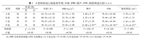 4组疑似冠心病患者性别、年龄、BMI、噪声、SNR、辐射剂量比较(
