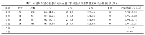4组疑似冠心病患者冠脉血管评估段数及图像质量主观评分比较[段(%)]