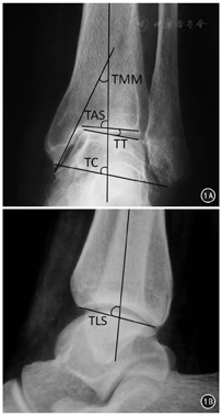 注:TAS为胫骨前侧关节面角,即前后位X线片上胫骨轴线与胫骨远端关节面的夹角;TT为距骨倾斜角,即前后位X线片上胫骨远端关节面与距骨穹隆关节面的夹角;TC为胫骨踝穴角,即前后位X线片上胫骨轴线与内外踝尖连线的夹角;TMM为胫骨踝穴角,即前后位X线片上胫骨轴线与内踝关节面的夹角;TLS为胫骨侧位关节面角,即侧位X线片上胫骨轴线与胫骨远端关节面的夹角