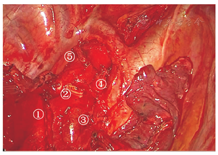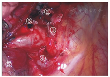 注:①为尖前支动脉;②为右上叶支气管;③为后升支动脉;④为肺静脉;⑤为肺裂;