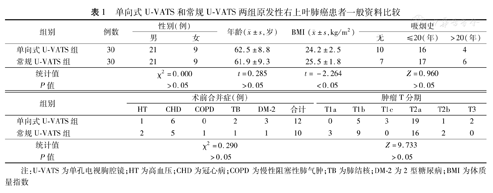 两组患者年龄、性别、内科合并症(高血压、冠心病、慢性阻塞性肺气肿、陈旧性肺结核、2型糖尿病)、肿瘤T分期(依据2015年第8版国际肺癌TNM分期)等差异均无统计学意义(P值均>0.05);单向式U-VATS组患者BMI低于常规U-VATS组,差异有统计学意义(P<0.05)。见表1。