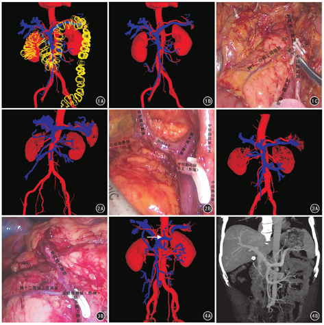 本研究运用的VR技术、融合图像,克服了以往多平面重建及层块最大密度投影等重建方式不能整体显示动静脉系统解剖的缺点,且通过添加伪彩的方法,将动静脉分别以不同颜色表示,更有利于识别和观察。通过三维融合图像可任意角度观察血管的形态以及走行,还可利用工作站对三维动态腹部CTA融合图像进行任意角度的倾斜、旋转,对病变、供血血管等进行全方位进行观察,这些均有助于优化手术方案的制定[20]。外科医生也可以运用融合图像结合最新3D打印技术制作模具,便于临床教学及术前向患者和家属解释手术途径[21]。