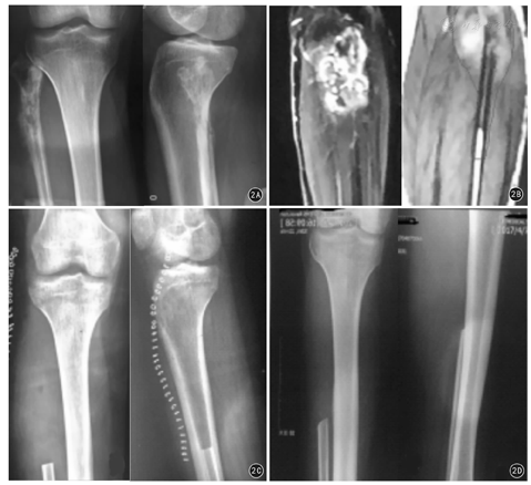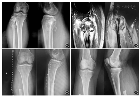 18例患者全部获得随访,随访时间7~120个月。8例出现肺部转移,死亡5例,另外3例患者截止末次随访时仍带瘤生存,皆进行口服阿帕替尼靶向治疗中。5例死亡患者中:1例入院即发生肺部转移,给予术后MTX化疗一次后患者肿瘤继续生长,2周后给予截肢手术,术后7个月死于肺衰竭;2例外院行非标准手术,导致局部间室污染,入院即行截肢手术,术后继续给予辅助化疗,分别于术后5、10个月发生肺部转移,并分别于术后8、12个月死于呼吸衰竭;2例接受Malawer type Ⅰ手术患者分别于术后18、36个月死于广泛肺转移引起的呼吸衰竭。15例保肢患者中1例出现术后伤口感染,给予积极加强换药,伤口正常愈合。复发4例皆为Malawer type Ⅰ手术患者,发现复发后均立即给予膝上截肢术。5例出现腓总神经损伤:其中2例患者术后2周神经麻痹症状逐渐自行好转,分别于术后3、7个月主诉症状基本消失;1例轻度跛行;2例Ⅱ型切除患者出现足下垂需佩踝关节支具行走。15例保肢手术患者无一例出现术后膝关节不稳症状表现,术后3个月MSTS功能评分显示术后膝关节功能良好11例、一般2例、差2例。患者具体资料见表1。典型病例见图1。