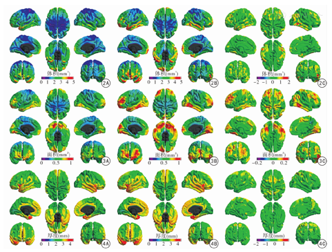将所有顶点的灰质体积、皮层表面积值求和即得到全脑的灰质体积、皮层表面积测量值,将所有顶点的皮层厚度值求平均值即得到全脑的皮层厚度值。将同组患儿每一顶点的测量值求平均值,并映射于皮层表面,即获得该测量值的均值图。将ISS患儿与CGHD患儿每一顶点的均值相减,并映射于皮层表面,即得到两组间均值差异分布图。
