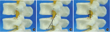 5个解剖点:a点,上位腰椎椎弓根根部外缘做垂线与上位腰椎下终板的交点;b点,做下位腰椎上关节突腹侧面切线,过a点做切线的垂直线,两线的交点为b点;c点,上位腰椎椎弓根根部外缘做垂线与下位腰椎上终板的交点;d点,椎间孔的最高点;e点,椎间孔的最低点。2线:M线,过e点沿下位腰椎上关节突腹侧面做切线;N线,a、c两点连线及其延长线。见图1A、图1B。