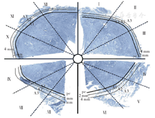 应用Photoshop 7.0绘图软件将大切片以病理切片中心为中点按顺时针分成12个均等片区并按顺时针编号,编号Ⅰ~Ⅻ。将前列腺左右两侧相对应的片区合并,成为腹侧区(Ⅻ+Ⅰ区)、腹前外侧区(Ⅱ+Ⅺ区)、前外侧区(Ⅲ+X区)、后外侧区(Ⅳ+Ⅸ区)、背后外侧区(V+Ⅷ区)和背侧区(Ⅵ+Ⅶ区)6个大切片扇形区域:其中,腹侧、腹前外侧、前外侧区为前列腺切片的上半部,后外侧、背后外侧和背侧区为前列腺切片的下半部;背后外侧区(V+Ⅷ区)为目前公认的经典神经血管束(neurovascular bundle, NVB )解剖区。然后再以前列腺包膜为界线对前列腺包膜外包含神经的周围组织进行更细分区:按照离前列腺包膜的距离2.0 mm和4.0 mm将每个片区进一步细分成3个环形观察区,从内到外距离前列腺包膜<2.0 mm为A1区、2.0~4.0 mm为A2区,>4.0 mm为A3区。至此所有标本前列腺包膜外区域均分为3个解剖区段、6个大切片扇形区域及18个观察区。见图2。
