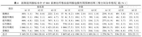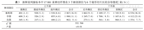±s表示,不同部位间各解剖区段、片区及观察区神经数目的分类资料的比较采用χ2检验。以P<0.05为差异有统计学意义。