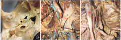 注:1为翼突内侧板根部;2为颈静脉窝后缘;3为枕髁外侧;4为枕骨基底部外侧;5为卵圆孔外界;6为棘孔外界;7为蝶棘外界;8为茎突;9为张肌-血管-茎突筋膜(黑线悬吊部分);10为二腹肌后腹;11为茎突舌肌;12为翼内肌;13为茎突前间隙;14为面动脉;15为颞浅动脉及伴行静脉;16为颈内静脉;17为茎突舌骨肌;18为茎突咽肌;19为翻起的翼内肌;20为翻起的张肌-血管-茎突筋膜