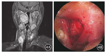 经口径路应严格掌握适应证,术前结合影像学等临床资料综合评估,对原发于咽旁间隙的良性肿瘤(除血管源性肿瘤),肿瘤突向口咽侧壁或软腭,边界清楚,位于颈动脉鞘内侧,与颈动脉鞘无明显粘连者,可考虑经口径路(图4)。对于茎突后间隙波及颈内动脉或需置换颈动脉的病变、波及茎突下颌管的唾液腺肿瘤、累及颅底骨质肿瘤以及副神经节瘤、体积过大的肿瘤等,不宜采用经口径路。在严格掌握手术适应证前提下,经口径路具有以下优点:路径短、视野清楚、创伤小,减少神经损伤和涎瘘风险,避免了面、颈部瘢痕、腮腺切除和咬合力下降等[36]。