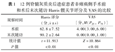 12例脊髓灰质炎后遗症患者非瘫痪侧手术前和术后末次随访Harris髋关节评分及VAS的比较