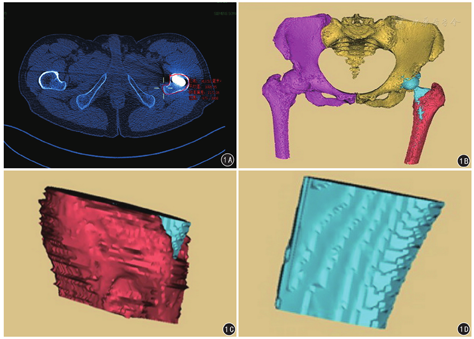 (1)一般资料:比较两组患者性别、年龄及髓腔闪烁指数(canal flare index, CFI)等。(2)治疗效果:对患者术后第2日髋部疼痛改善情况进行VAS评估;术后12周使用Harris髋关节评分(harris hip score, HHS)标准评价患者髋部的整体功能,具体从疼痛、功能、髋关节活动和肢体畸形四个方面来评估,90~100分为优、80~89分较好,70~79分为尚可,<70分为差。(3)股骨假体位置及稳定性评估:参考Mulliken标准,术后即刻采用X线测量评估股骨假体置换后股骨柄的初始位置,以股骨柄居中或内外翻角度≤3°,同时股骨柄压配率于X线正位片达80%、侧位片达70%为股骨柄初始稳定性优良,未达此标准的为差。(4)双下肢绝对长度差:在手术前后双髋X线正位片上,分别测量双侧小转子基底部到坐骨结节连线的高度,记录两侧差值。(5)两组假体骨量保留参数比较:基于CT三维重建影像,于股骨小转子最宽部层面,测量股骨外层皮质、假体外层平面的面积,两者差值即为小转子最宽部骨量保留面积;应用Mimics 17.0软件重建并测量大转子最宽部至小转子最宽部容量体积,减去对应部位的假体体积,即为大小转子间骨量保留体积。见图1。(6)术中及术后早期并发症:股骨近端医源性骨折、大腿远端疼痛等。