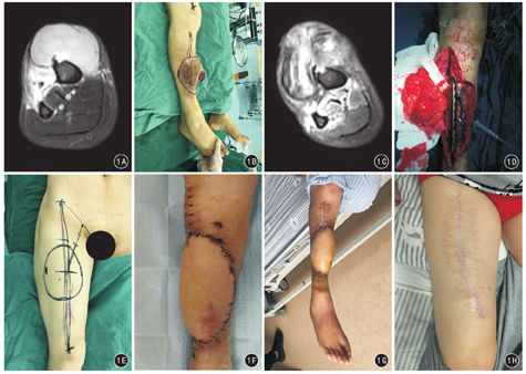 术后13例均获随访,随访时间9~57个月,平均24.5个月。13例皮瓣外形好,外观无臃肿,感觉部分存在。13例中,3例放疗后皮瓣局部色素沉着、质地变硬,但无皮瓣坏死;余皮瓣色泽和质地均良好。移植皮瓣疗效评分7~9分,疗效满意。随访期间患肢可负重行走,无供区肿瘤种植。术前放化疗疗效评定为部分缓解3例,疾病稳定4例,疾病进展2例。13例患者中:无瘤生存10例,其中因小腿肿瘤复发行小腿截肢手术1例;肺转移3例,其中1例带瘤生存,2例分别于术后1年和1.5年死亡,均死于呼吸衰竭。典型病例见图1。