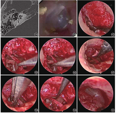全身麻醉,控制性低血压。仰卧位头偏向健侧,患耳略朝上。连接直径2.7 mm、长度18 cm的耳内镜与高清摄像系统(德国STORZ公司)。10 mL生理盐水中加10滴0.1%肾上腺素,取2 mL在耳内镜下行外耳道四壁皮下注射至四壁变苍白,以减少切口出血。距鼓环约8 mm自12点至6点方向以针状电刀弧形切开外耳道皮肤直达骨面,耳显微剥离子掀起外耳道皮瓣至纤维鼓环,采用浸有肾上腺素的棉片止血。将皮肤鼓膜瓣一并向前掀至外耳道前壁并注意识别保护鼓索神经。进入中耳后观察面神经、听骨链、前庭窗和圆窗等重要中耳结构,注意面神经是否低垂或遮窗。调整镜头观察镫骨肌腱及锥隆起,当镫骨后弓和底板被遮挡时,将上鼓室外侧壁及部分外耳道后壁骨质用刮匙刮除或电钻磨除。如遇狭窄弯曲外耳道,可先使用电钻进行外耳道成形,以便增加暴露范围和操作空间。探查听骨链,观察两窗试验,确定镫骨固定后,测砧骨长脚至镫骨底板间距;三棱针于镫骨底板后下部中央造孔;松解砧蹬关节,镫骨剪剪断镫骨肌腱及镫骨前后弓,取出镫骨板上结构;选取比患者砧骨长脚至镫骨底板距离长0.5 mm、直径0.4 mm的人工镫骨(德国宾格公司,Piston),将其末端放在镫骨底板造孔处,挂钩端以适当力度夹持在砧骨长脚的位置。小块肌肉筋膜封闭镫骨底板开窗处,轻触锤骨柄检查听骨链联动性,确保听骨链联动好,假体固定牢固。复位外耳道皮肤鼓膜瓣,瓣外填塞适量明胶海绵,术耳无需加压包扎。