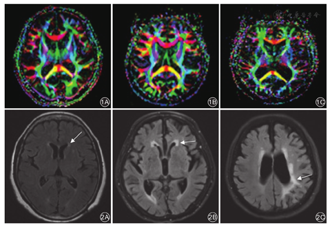 AD早期并不容易被发现,但随着MRI技术的发展,学者们发现DTI作为一种新的、基于MRI的无创技术,可以用于描绘大脑白质的微结构变化[32]。DTI基于对水分子弥散运动成像,可以检测出白质纤维束的方向和完整性[33]。DTI技术中最常用的两个参数为ADC和FA。ADC被用来测量感兴趣区内水分子弥散运动的速度和范围,不具有方向性,反映出细胞膜的完整性。FA代表水分子扩散各向异性,具有方向性,FA值则反映水分子在各个方向运动的限制性。影响FA值的主要因素有髓鞘的完整性、白质纤维束的密度及排列一致性、纤维的平均直径等。FA值越低说明各向异性越差,白质纤维密度降低,排列一致性下降,白质纤维束损害的越严重。ADC值的升高表示自由水含量增高,细胞膜的完整性被破坏。WML的病理改变特征为髓鞘纤维的减少伴随细胞外间隙的增加。有研究表明,DTI与WML的严重程度有关,病变程度越重,FA值越低、ADC值越高,而且FA值的降低和ADC值的升高与认知功能损害之间具有相关性[34]。由此可见DTI可以为中枢神经系统白质的微观结构提供宏观的观察,其与衡量认知功能的改变具有更好的相关性[35]。本研究分析了两组间不同部位FA值与ADC值,发现AD患者额叶、顶叶和半卵圆区的FA值以及额叶和半卵圆区的ADC值与对照组存在差异。近年来,关于DTI对于认知功能评估的研究多集中于上述脑区域[36]。通过DTI技术观察脑小血管病变白质纤维束的损害,可以为认知功能损害提供影像学依据,有助于认知功能损害的早期判断与防治。