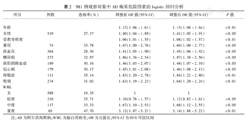 981例观察对象中AD痴呆危险因素的logistic回归分析