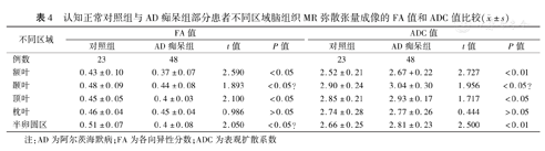 认知正常对照组与AD痴呆组部分患者不同区域脑组织MR弥散张量成像的FA值和ADC值比较(