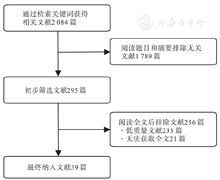 本文以"分化型甲状腺癌""淋巴结转移""侧颈淋巴结转移""颈淋巴结清扫术""侧颈淋巴结清扫术""differentiated thyroid cancer""cervical lymph node metastasis""lateral cervical lymph node metastasis""neck dissection""lateral neck dissection"等为中、英文关键词,在中国知网、万方数据库、PubMed等中、英文数据库中检索2019年12月之前发表的有关DTC侧颈部淋巴结转移特点及其诊疗进展方面的文献2 084篇,排除无法获取全文、内容不符、重复性及低质量的文献,最终纳入39篇文献,进行分析和总结。见图1。
