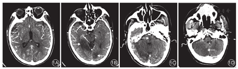 患者术前均进行CTA pc-ASPECT评分。由两名神经内科医师分别对患者的CTA影像资料进行盲法评分,意见不一致时经协商决定最后结果。该CTA pc-ASPECT评分中,总分为10分,左右两侧丘脑、小脑以及大脑后动脉供血区的每一早期缺血性改变分别减1分,中脑或桥脑任何区域的早期缺血性改变减2分。早期缺血性改变定义为CTA源影像上的低密度灶或灰白质模糊区。典型病例见图1。