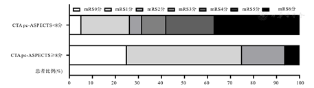 术后3个月预后良好的22例患者CTA pc-ASPECT评分的ROC曲线分析:AUC为0.930,最佳界值点是7.5分,灵敏度为72.7% ,特异度为100%(图2)。以ROC曲线分析所得界值点为界值,将所有患者分为CTA pc-ASPECT评分<8分组和评分≥8分组。CTA pc-ASPECT评分≥8分的AVBO患者经血管内治疗后3个月时预后良好,<8分的患者预后不良,两组mRS评分分布见图3。