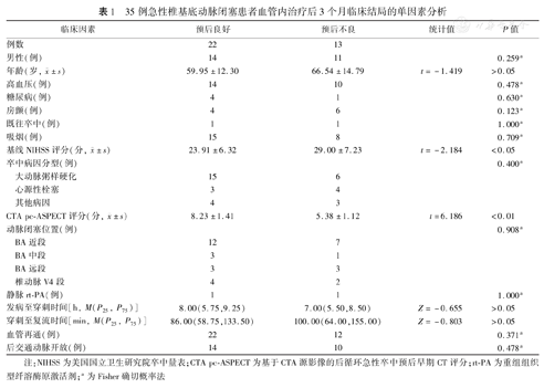 35例急性椎基底动脉闭塞患者血管内治疗后3个月临床结局的单因素分析