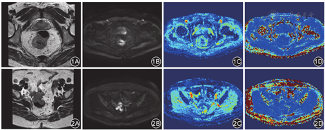 167例直肠腺癌患者中,野生型组(TA6/6)患者的ADC、MD值均明显高于突变型组患者(TA6/7与TA7/7),而MK值明显低于突变型组患者,差异有统计学意义(P值均< 0.01),见表1。典型病例见图1、图2。