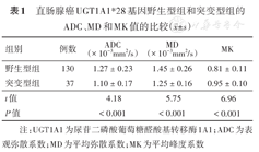 注:UGT1A1为尿苷二磷酸葡萄糖醛酸基转移酶1A1;ADC为表观弥散系数;MD为平均弥散系数;MK为平均峰度系数