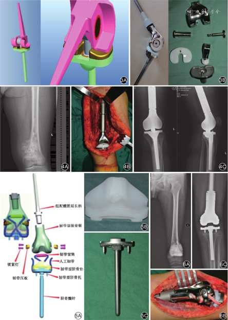 无菌性松动假体和假体的机械性失败仍然是假体失败的主要原因。假体的铰链型刚性链接是导致假体松动和机械性失败的重要因素。郭卫团队针对传统铰链型膝关节假体在临床应用中的并发症问题进行了深入研究,研发了双动型人工膝关节假体,旨在降低铰链型连接的膝关节假体的并发症。该假体由于采用了旋转轴的半球状结构设计,在假体屈曲运动时,由于球窝的运动可以达到泄力的作用,明显降低了膝关节活动过程中对关节假体柄的应力集中,理论上可以有效降低假体柄的折断及松动的发生率。临床上使用短期随访效果良好(图3、4),长期使用结果还在随访中。该型膝关节假体设计在2015年获得国家发明专利。