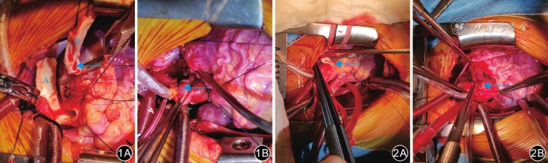 术前不吸氧,对心功能较差的重症患儿的前负荷进行精准管理,诊断后即接受手术治疗。手术在全身麻醉、气管插管、低温体外循环下进行,常规放置食管超声。正中开胸,升主动脉和上下腔静脉插管,升主动脉插管位置尽量靠上,紧邻头臂干开口。需要心内操作者经右心房-房间隔置心内吸引,单纯ALCAPA经右上肺静脉置心内吸引。直肠温度维持在28~32 ℃。体外循环开始后,血管钳阻断主肺动脉远端或分别阻断左右肺动脉以防止冠状动脉窃血加重,升主动脉阻断后以Del Nido停跳液根部灌注进行心肌保护,维持量通过左右冠状动脉口直接灌注及冠状静脉窦逆行灌注作为补充。