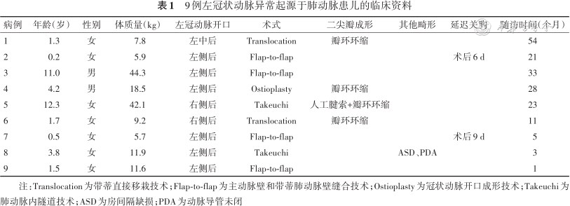 回顾性研究。纳入2015年2月—2020年10月天津市泰达国际心血管病医院心外科9例ALCAPA手术治疗患儿的临床资料。其中男2例、女7例,年龄0.2~12.3岁(中位年龄1.7岁),体质量5.7~44.3 kg(中位体质量11.6 kg)。1例患儿因术前未发现ALCAPA,仅行心脏彩超、胸部X线片和心电图等常规检查;余8例患儿均接受CTA检查。2例患儿术前左心室射血分数(left ventricular ejection fraction,LVEF)<40%,其中1例合并LCA开口狭窄;1例合并房间隔缺损及动脉导管未闭,余8例为单纯性ALCAPA。见表1。术前二尖瓣反流7例,其中重度1例、中度4例、轻度2例;无反流2例。