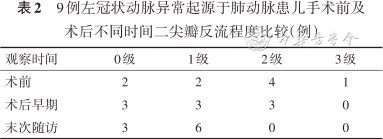 9例左冠状动脉异常起源于肺动脉患儿手术前及术后不同时间二尖瓣反流程度比较(例)