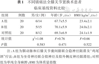不同镇痛法全膝关节置换术患者临床基线资料比较