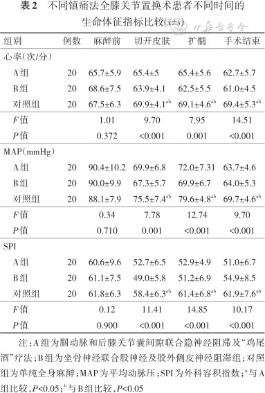注:A组为腘动脉和后膝关节囊间隙联合隐神经阻滞及“鸡尾酒”疗法;B组为坐骨神经联合股神经及股外侧皮神经阻滞组;对照组为单纯全身麻醉;MAP为平均动脉压;HR为心率;SPI为外科容积指数;a与A组比较,P<0.05;b与B组比较,P<0.05