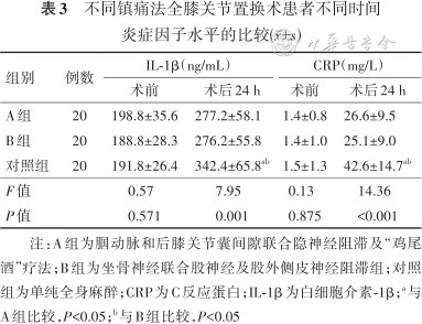 注:A组为腘动脉和后膝关节囊间隙联合隐神经阻滞及“鸡尾酒”疗法;B组为坐骨神经联合股神经及股外侧皮神经阻滞组;对照组为单纯全身麻醉;CRP为C反应蛋白;IL-1β为白细胞介素-1β;a与A组比较,P<0.05;b与B组比较,P<0.05