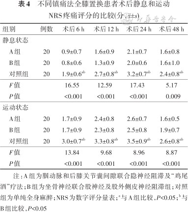 术后各时间点A、B组静息及运动NRS疼痛评分均明显低于对照组,差异均有统计学意义(P值均<0.05)。A组与B组比较差异均无统计学意义(P值均>0.05)。见表4。