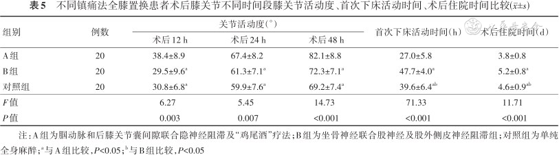 3组患者的首次下床时间及术后住院时间:A组最短,对照组其次,B组最长,差异均有统计学意义(P值均<0.05)。术后12、24和48 h膝关节活动度:A组明显大于B组和对照组,差异均有统计学意义(P值均<0.05),B组与对照之间差异均无统计学意义(P值均>0.05)。见表5。