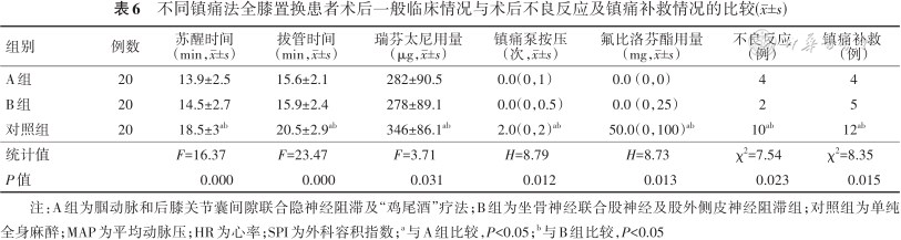 注:A组为腘动脉和后膝关节囊间隙联合隐神经阻滞及“鸡尾酒”疗法;B组为坐骨神经联合股神经及股外侧皮神经阻滞组;对照组为单纯全身麻醉;a与A组比较,P<0.05;b与B组比较,P<0.05