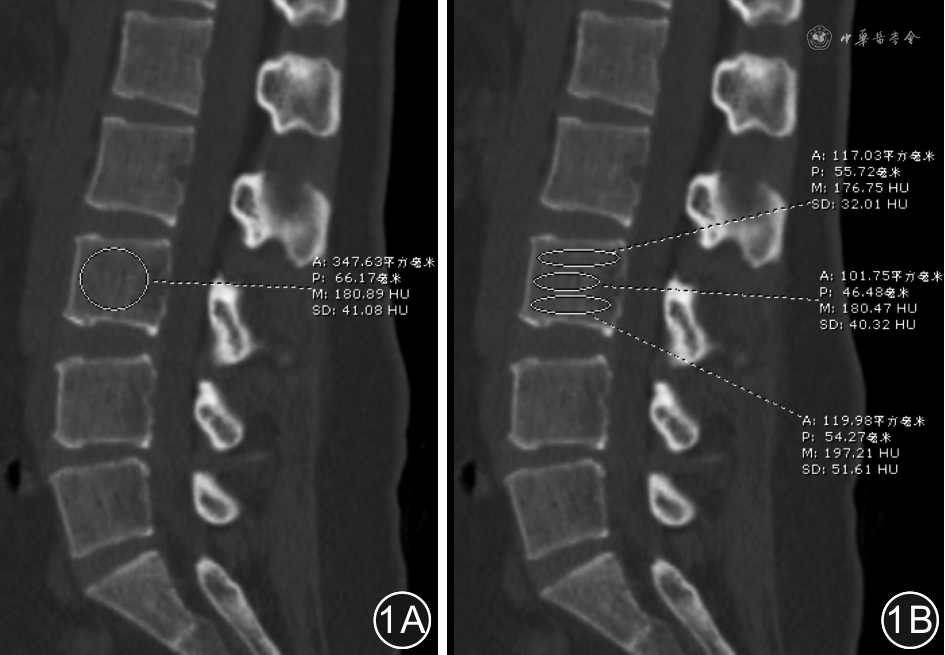 腰椎退变性疾病的发生多数源于椎间盘退变。成人椎间盘是人体最大的无血管组织,纤维环的营养供应主要依靠椎体周围起自脊椎动脉的小血管,髓核的营养则通过椎体终板的渗透获得。椎间盘和椎体生理功能与其胚胎发育、血液供应密切相关。椎体骨质疏松可加速椎间盘的退变,标准抗骨质疏松治疗方案能有效防治腰椎间盘突出症[1, 2]。目前,多采用双能X线吸收测定法(dual-energy X-ray absorptiometry,DEXA)测量骨质密度,但该方法无法区分松质骨与皮质骨。老年患者存在腹部血管壁钙化、椎体边缘骨赘增生和小关节增生时常导致DEXA测量值过高,不能准确反映椎体真实的骨密度,降低骨质疏松诊断的准确性和可靠性[3, 4]。而基于CT矢状位二维重建影像,通过单独测量椎体皮质骨和松质骨骨密度值(HU),提供椎体整体和局部骨密度数据,进而评估骨质疏松的方法在临床中已被广泛应用,其可靠性和准确性已被证实[5, 6, 7]。