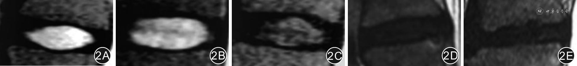 基于腰椎MRI表现,采用Pfirrmann分级标准[11],将腰椎间盘退变分为5级:Ⅰ级,髓核呈高信号,信号均匀,椎间隙高度正常;Ⅱ级,髓核呈高信号,信号不均匀,有或无水平方向低信号条带,椎间隙高度正常;Ⅲ级,髓核呈灰色,信号欠均匀,椎间隙有或无轻度狭窄;Ⅳ级,髓核呈低信号,信号不均匀,与纤维环分界模糊不清,椎间隙出现轻度或中度狭窄;Ⅴ级,髓核呈无信号的黑色,椎间隙重度狭窄。见图2。