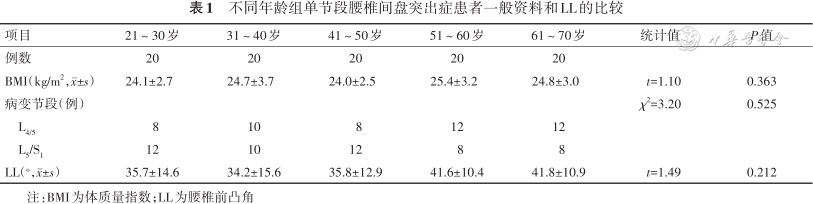 不同年龄组单节段腰椎间盘突出症患者一般资料和LL的比较