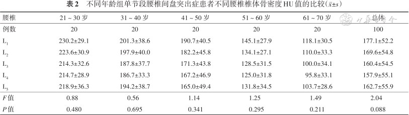 不同年龄组单节段腰椎间盘突出症患者不同腰椎椎体骨密度HU值的比较(±s)