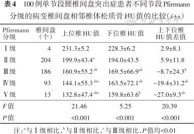 100例患者病变椎间盘Pfirrmann分级:Ⅰ级4例,Ⅱ级204例,Ⅲ级186例,Ⅳ级93例,Ⅴ级13例。随着椎间盘退变分级的升高,上位椎体松质骨HU值和下位椎体松质骨HU值表现出下降趋势,上位和下位椎体松质骨HU值的差值逐渐增加,差异均有统计学意义(P值均<0.01)。见表4。