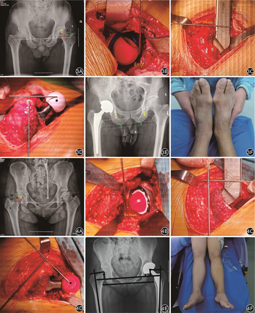 (2)患侧髋臼旋转中心高度(A′)。术中安放好髋臼假体、内衬后,放置与内衬相匹配的股骨头试模,紧贴髋臼下缘最隆起处(即X线平片上的泪滴下缘)垂直于手术床放置1枚克氏针。A′=股骨头试模的半径+股骨头试模到克氏针距离(E)。若克氏针在股骨头试模以远,E为正值;反之,E为负值。见图3B、4B。