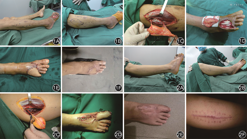 趾皮瓣修复完成 2E 术后7个月,皮瓣完全成活,外观无臃肿,色泽与周边皮肤相同,负重行走无不适 2F 术后7个月供区外观1981年,Haertsch[13]在22具成人尸体解剖基础上首次证实了腘窝皮动脉的存在。1982年,柏树令和李吉[14]将腘动脉皮支分为3支,分别以腓肠外侧皮动脉、腓肠中间皮动脉和腓肠内侧皮动脉命名,并首次提出了以腓肠外侧皮动脉作为血管蒂的一个新皮瓣,即腘动脉外侧皮支皮瓣。腘动脉皮支皮瓣临床应用中,绝大部分是带蒂局部转移修复邻近创面,游离移植鲜有报道[15]。2014年,林涧等[16]报道于膝关节平面上7~11 cm处,半腱肌与股二头肌间隔(相当于腘窝上角)有起源于腘动脉的皮支,沿股后中线上升,与臀下动脉或股深动脉的穿支血管吻合,该皮支与以往报道的腘动脉皮支在解剖位置及血管走行上均有较大差异。