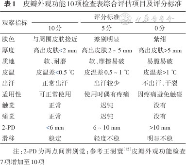 注:2-PD为两点间辨别觉;参考王澍寰[12]皮瓣外观功能检查7项增加至10项