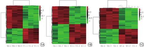 注:X轴为基因样本名称;Y轴为基因探针聚类;红色方块为表达上调的基因;绿色方块为表达下调的基因;T0为坐骨神经损伤后0 d;T1为坐骨神经损伤后3 d;T2为坐骨神经损伤后7 d;T3为坐骨神经损伤后14 d