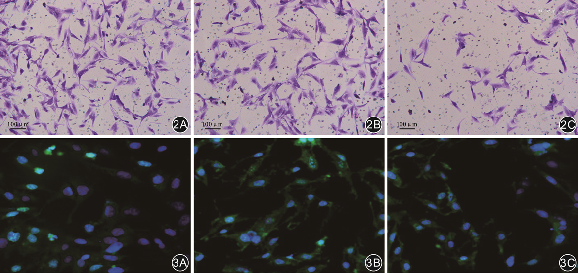 取转染后的对照组、siRNA组和siRNA-MX1组雪旺细胞,收集细胞,调整细胞浓度为2×105/mL的细胞悬液。在小室膜的底面涂敷10 µg/mL纤连蛋白,Transwell上腔室中加入500 µL雪旺细胞悬液,下腔室中加入含10%PBS的RPMI-1640培养基。将Transwell小室于37 ℃、5% CO2培养箱中孵育24 h,用棉拭子擦去上层小室滤过膜上表面的细胞,无水甲醇固定滤过膜下表面细胞30 min,0.1%结晶紫染色。使用倒置显微镜随机选取9个视野,对侵袭细胞数目进行计数。实验重复3次,结果取平均值。