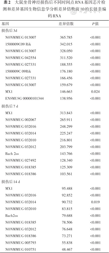 大鼠坐骨神经损伤后不同时间点RNA基因芯片检测和差异基因生物信息学分析差异倍数前10的长链非编码RNA